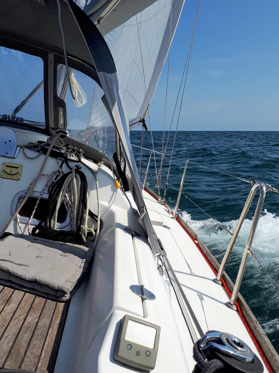08:45 : passage de la rade du port de Saint-Quay, nous nous mettons face au vent à 8h55, envoi de la grand-voile. Pour le génois, Didier doit aller à l’avant du bateau pour enlever la sangle que nous utilisons pour le sécuriser sur l’enrouleur quand nous sommes à l’escale (qu’on a oublié de retirer). Le génois est lancé à 9h10, nous arrêtons le moteur.