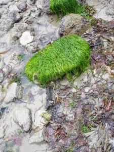 L'après-midi n'a pas été tout à fait perdue puisque nous avons pu observer de jeunes tourteaux cachés dans des creux de rochers derrière des touffes de varech et le balai des tout jeunes bernard-l'hermite à la lisère de l'eau qui courent après la vague et s'enterrent dans le sable dès qu'elle est passée.
