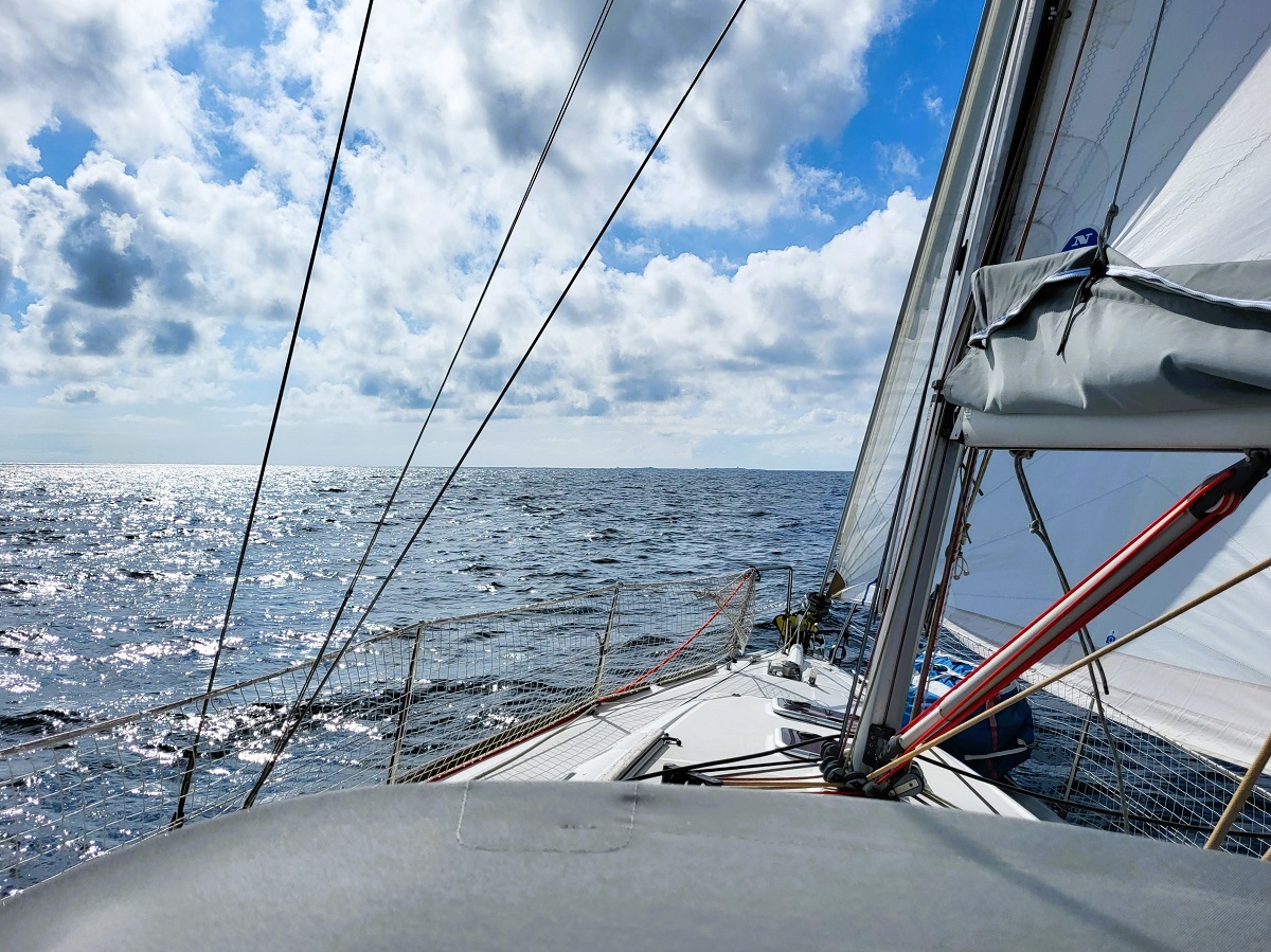 Cette navigation avait déjà mal commencé puisque nous avons accroché l’antenne du détecteur radar de notre voisin en sortant de notre place à Port-Louis. Ensuite à la sortie du port, nous n’étions pas sur la bonne fréquence VHF pour le chenal et avons loupé des informations importantes …