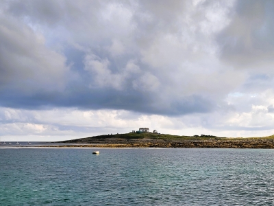 Les conditions météo n’étant pas trop mauvaises, nous décidons de mouiller devant Penfret, une des îles de l’archipel des Glénan. Nous préférons éviter « la chambre » située au centre des îles, dont la couleur bleu turquoise et les eaux cristallines attirent beaucoup de monde, mais que nous jugeons trop risqué vu notre tirant d’eau.